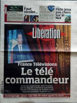 LIBERATION [No 8571] du 25/11/2008 - france televisions - le tele commandeur, sarkozy temoignage, jouer son role de mere apres la mort spermatozoides, l'autre crise des bourses p.s. , faut recoler futurs, on a retrouve le damant bleu du roi video , mille jeux pas chers sur le net portrait de claude puel PDF Online